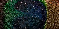 Pauwblauw abstract: Druppeltjes op een stukje van een pauwenveer van Marjolijn van den Berg
