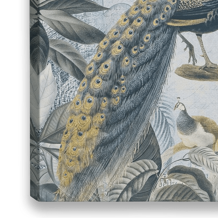 Pauwenpaar met kroon in een mystiek bos, vintage illustratie in monochrome blauwe en gouden tinten