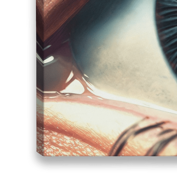 Het digitale kunstwerk Pauwenoog: de kunst van het zien portretteert een oog van een pauwenstaart in de iris van het menselijk oog. De kleurrijke veren van de pauw vormen een abstracte achtergrond voor het oog, terwijl de details van het oog zelf opvallen door hun scherpte en precisie.