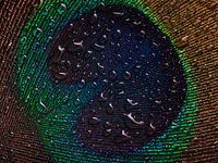 "Pauwenveer met druppels" is een macrofoto van het hart van een pauwenveer, waar druppels op liggen. Doordat de pauwenveer met een macrolens is gefotografeerd, is de structuur van deze prachtige veer te zien. De kleuren zijn voornamelijk blauw, groen, cyaan en bruin en vormen samen een mooie kleurrijk geheel, wat wel subtiel is en niet te bont.