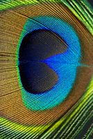 een enkele natuurlijke kleurrijke pauwenveer macrofoto met levendige blauwe achtergrond.