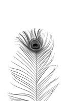 De zwart-wit foto toont een elegante pauwenveer tegen een strakke, witte achtergrond. Door het ontbreken van kleur komt de focus volledig te liggen op de fijne details en texturen van de veer. De delicate structuren van de haartjes zijn scherp zichtbaar, met hun zachte, bijna zijdeachtige uitstraling. Het kenmerkende oog van de pauwenveer, normaal zo kleurrijk en opvallend, is hier een samenstelling van verschillende grijstinten, die een intrigerend patroon en diepte geven. De witte achtergrond zorgt ervoor dat de veer als het ware zweeft in het beeld, zonder afleiding of concurrentie. Door de monochrome weergave krijgt de foto een tijdloze, bijna artistieke sfeer, die de schoonheid van de natuur op een subtiele en elegante manier benadrukt. De veer lijkt fragiel en toch vol kracht, met een natuurlijke symmetrie die rust en harmonie uitstraalt. Deze afbeelding nodigt uit tot bewondering van de kleine, vaak over het hoofd geziene wonderen om ons heen, en laat zien hoe zwart-wit fotografie de essentie van een object kan versterken.