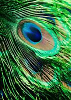 Geef uw muren kunst en maak er een echt thuis van. Een expressionistisch schilderij van een pauw in detail. Een pauwenveer in gouden kleuren en groentinten tegen een schitterende achtergrond.