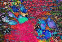 Deze prachtige explosie van kleur is er een uit een serie Barnie Paw Print Designs, gebaseerd op een originele foto van pootafdrukken van een hond in nat beton. Barnie was een lieve puppy maar nogal ondeugend, niet meer dan toen hij besloot te gaan spelen in het natte beton dat net gelegd was. Helaas werd het pas ontdekt toen het begon te stollen, maar ik vond het wel leuk! Ik nam een foto van de pootafdrukken en dat leidde tot de ontwikkeling van Barnie Paw Print Designs, waarvan er nu meer dan 100 bestaan, moderne, hedendaagse abstracties met Barnie's pootafdrukken. Deze is mijn favoriet, maar ook mijn bestseller, hij heet Paw Prints Color Explosion, een prachtige diepe kleur roze met rood, geel, blauw, biolet en nog wat andere kleuren. Zo mooi!