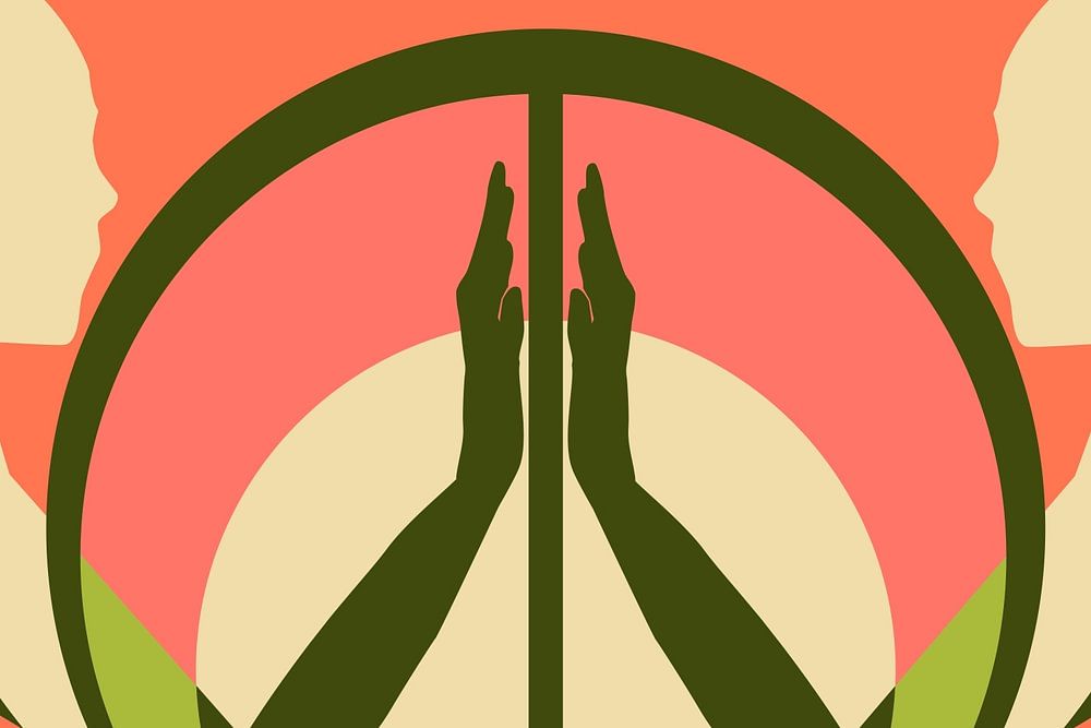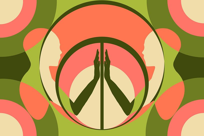 Twee menselijke figuren die met ieder een hand naar elkaar, samen het peace-sybool vormen in een werk vol met rondingen en in een beetje retro stijl en kleuren. Two human figures, each holding a hand to the other, together forming the peace symbol in a work full of curves and in a somewhat retro style and colors. Zwei menschliche…