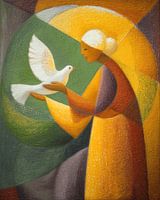Abstracte illustratie in aardetinten met een vrouw en een vredesduif en met als thema Vrede