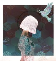 Fotomontage op canvas textuur in groen tinten met een vrouw, hexagon vormen en een vredesduif.