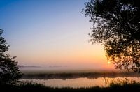 Een kleurrijke zonsopkomst boven een met mist bedekt weiland.