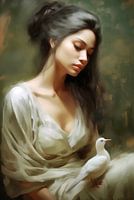 Klassiek romantisch portret van een serene vrouw met een witte duif.