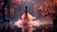 Wandel langs kabbelende beekjes en bewonder de sierlijke bloesems in zachte perzikkleuren. De afbeelding straalt een vredige sereniteit uit, waardoor je de harmonie van de natuur en de rust van een Japanse tuin in huis haalt. De pastelkleurige tinten roepen een gevoel van tederheid en dromerigheid op, terwijl de details van de tuin een verfijnde esthetiek toevoegen.