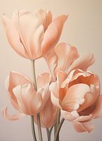 Peach Fuzz Tulpen | Tulpen Schilderij - Dit elegante en serene schilderij toont een groep tulpen in rustgevende Peach Fuzz tinten die zachtjes overgaan van oranje naar crèmewit. De achtergrond in neutraal beige draagt bij aan de kalme uitstraling, terwijl de subtiele details en schaduwen in de bloemblaadjes een gevoel van diepte creëren.