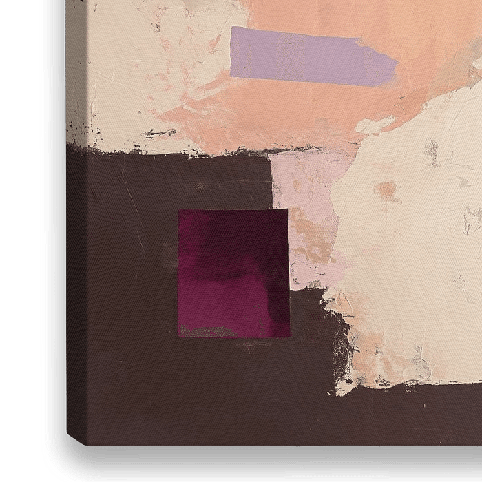 Dit abstract schilderwerk speelt meesterlijk met geometrische vormen en een verfijnd kleurenpalet dat van zacht koraal tot diep aubergine loopt. Doordat vlakken elkaar overlappen en subtiel tegen elkaar afzetten, ontstaat een dynamische compositie die tegelijk rustgevend werkt. De rauw afgewerkte kanten en de contrasterende texturen…