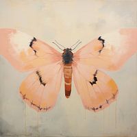 Peach Vlinder - Centraal staat een vlinder, haarscherp tegen een zacht geabstraheerde achtergrond. De kleur Peach Fuzz geeft delen van de vleugels een warme uitstraling, terwijl donkere accenten het geheel een zekere diepgang verlenen. De compositie straalt rust uit en combineert realistische details met subtiele, sfeervolle tinten.