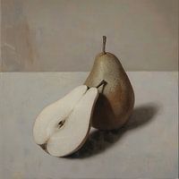 Peared Down - Dit stilleven schilderij toont een nauwgezet realistische afbeelding van een gehele peer naast een half doorgesneden peer, uitgelicht door zachte schaduwen en subtiel lichtspel dat de textuur en sappigheid accentueert.