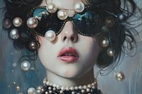 Pearl Gaze - Dit portret schilderij toont een vrouw met overdadige parels en stijlvolle zonnebril omgeven door zwevende parels, waarbij nadruk op de glanzende texturen en reflecties ligt.