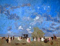 Onder een heldere lucht in licht blauw bevinden zich mensen die buiten aan het eten zijn, aan het picknikken. Bij de piknik hebben de mannen en vrouwen dieren en een koets met paard.
