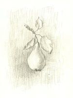 Peer met bladeren is een potloodtekening in portretformaat getekend door de kunstenaar Karen Kaspar. Een verse peer hangt aan een tak en wordt omlijst door drie bladeren. De achtergrond is geabstraheerd. De zwart-wit tekening is getekend op lichtbeige papier. De wat onregelmatige kleuring van het papier geeft de afbeelding een vintage uitstraling, alsof de tekening uit vervlogen tijden komt of uit een oud boek.