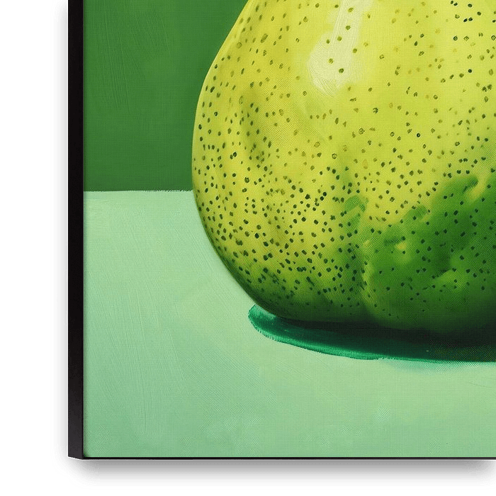Een kunstwerk van een groene peer. Het hele schilderij is in groentinten.