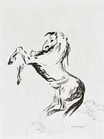 Een paard uit de wereld van de fantasie steigert en springt door de wolken op deze illustratie of tekening.