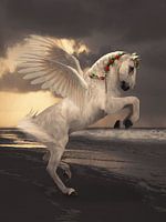 Wit paard met vleugels steigerend bij de zee. Rode rozen in het haar. Pegasus, een mythologisch paard