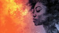 Dit grafisch geabstraheerde zijportret toont een peinzende jonge zwarte vrouw tegen een vage, heldere achtergrond. De artistieke weergave geeft de figuur een tijdloze en universele kwaliteit. De gedachten van de vrouw zijn gevangen in de abstracte vormen en lijnen, terwijl de achtergrond een sfeer van reflectie creëert met een glinsterende glans. Het spel van licht en onscherpte creëert een poëtische stemming die de kijker uitnodigt om de innerlijke wereld van de afgebeelde persoon te verkennen. Een visueel gedicht van introspectie en schoonheid dat de kracht van abstractie gebruikt om de diepte van de menselijke ervaring over te brengen.