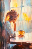 De zachte penseelstreken ontvouwen de stille aantrekkingskracht van een contemplatief moment. Warm licht stroomt door het raam en danst over het hout, terwijl een jonge vrouw, in gedachten verzonken, een gouden kopje vasthoudt. De harmonieuze kleurtonen smelten samen en creëren een sfeer van intimiteit en melancholie die de ziel zachtjes omhult.
