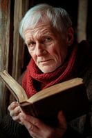 Een peinzende oudere heer, gevangen in de bladzijden van een oud boek, straalt een tijdloze wijsheid uit. Zijn expressieve blik en gewaagde sjaal geven het tafereel warmte en gezelligheid. Ideaal voor in de woonkamer, waar hij uitnodigt om te blijven hangen en nadenken terwijl verhalen tot leven worden gebracht.