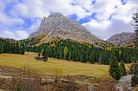 Uitzicht vanaf de Würzjochstraße naar de Peitlerkofel (Sass de Putia), omgeven door herfstkleurige lariksen. Italië, Zuid-Tirol, Dolomieten. Herfst 2017