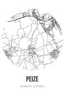 Zwart-witte landkaart, stratenplan of plattegrond van Peize. Peize is gelegen in de gemeente Noordenveld, provincie Drenthe. Op de stadskaart zijn alle openbare wegen in Peize opgenomen. Verder is de kaart voorzien van de coördinaten van het centrum van Peize.