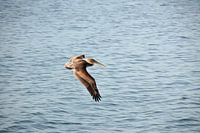 Een bruine Pelikaan in duikvlucht boven de Stille Oceaan. Door de rust in de foto kan deze mooi groot geprint worden, bv op canvas.