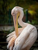Een Pelikaan bezig met de persoonlijke verzorging van zijn verenkleed.