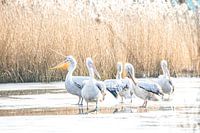Groepje pelikanen in de zon op het ijs, tussen het riet