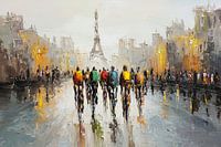 Dit schilderij vangt de dynamiek van een wielerpeloton dat zich een weg baant door een glinsterende, natte Parijse straat, met de iconische Eiffeltoren die als een zachte silhouet uit de ochtendnevel oprijst. De kunstenaar gebruikt dikke verfstreken en warme tinten geel, oranje en goud die prachtig contrasteren met de koele grijstinten…