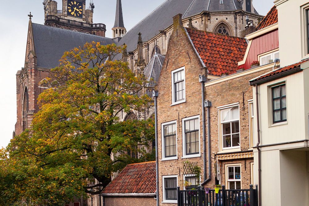 Pelserbrug en oude grachtenpanden land de Voorstraathaven en de Grote Kerk op de achtergrond in Dordrecht in Nederland