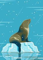 Mijn illustratie toont een pelsrob op een ijsschots in de ijzige wateren van Antarctica. Terwijl hij omhoog kijkt naar de vallende sneeuwvlokken, wordt de serene en koude schoonheid van het zuidpoolgebied vastgelegd.