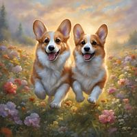 Pembroke Welsh Corgi spelend in een bloemenveld van Johannas Art Creations