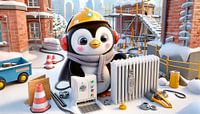 Op de foto zie je een schattige kleine pinguïn verkleed als verwarmingsmonteur die een winterse bouwplaats inspecteert. Gewapend met een gele helm met het symbool voor verwarming en een knusse sjaal staat de pinguïn voor een radiator. Het winterse tafereel is bedekt met sneeuw, die de daken en trottoirs in een witte deken hult. Op de…