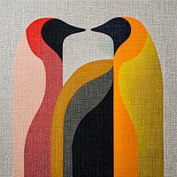 Abstracte weergave van twee penguins in rode, zwarte, gele warme tinten.