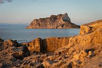 Zonsopgang aan de Middellandse Zeekust tussen Benissa en Calpe. De Peñón de Ifach rijst majestueus op uit de Middellandse Zee. Warm ochtendzonlicht schildert de kliffen in de kleuren oranjebruin tot roodbruin.