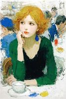 Over ‘Pensive Beauty at Café’ van OMG Art