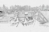 Pentekening van besneeuwde fiets aan de Amstel in Amsterdam