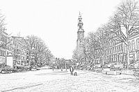 Pentekening van winter in Amsterdam op de Prinsengracht met de Westerkerk in Nederland