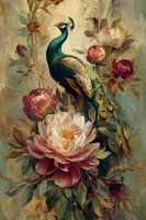 Een klassiek schilderij waarin een majestueuze pauw elegant poseert tussen weelderige pioenrozen in verschillende tinten roze. Het kunstwerk straalt een tijdloze romantische sfeer uit met zijn warme, gouden achtergrond en de zachte, vloeiende penseelstreken. De combinatie van de intense turquoise veren van de pauw en de delicate…
