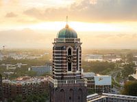 De Peperbus, officieel de Onze-Lieve-Vrouwetoren, is zonder twijfel het meest herkenbare symbool van Zwolle. In deze opname, gemaakt bij zonsopkomst, straalt de toren een bijna magische rust uit. Het warme ochtendlicht vouwt zich om de iconische koperen koepel en laat de roodbruine bakstenen façade zacht gloeien. De zon breekt net door de wolken heen, wat zorgt voor een gouden gloed die de historische toren als het ware verheft boven de stad.