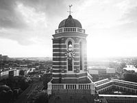 Deze adembenemende zwart-wit luchtfoto vangt de serene pracht van Zwolle met een ongeëvenaarde elegantie. Op de voorgrond torent de imposante Peperbus, officieel bekend als de Onze-Lieve-Vrouwetoren, majestueus boven de stad uit. Het historische bouwwerk, met zijn kenmerkende koepel en verfijnde architectonische details, staat symbool…