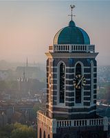 Deze foto toont de elegante Peperbus, het iconische torengebouw van Zwolle, gehuld in de zachte gloed van een mistige ochtend. De klok torent trots uit boven de stad, terwijl de historische gebouwen in de verte nog gedeeltelijk verborgen zijn onder een sluier van ochtendnevel. Het licht van de opkomende zon werpt een delicate roze tint over de scène, wat een gevoel van rust en tijdloosheid creëert.