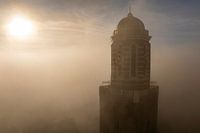 De Peperbustoren van de rooms-katholieke Onze Lieve Vrouwe ten Hemelopneming-basiliek in Zwolle steekt boven de mist uit. De kerktoren, die Peperbus (peperbus) wordt genoemd, is een van de hoogste en beroemdste kerktorens van Nederland.