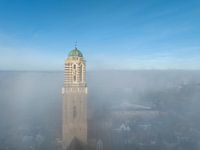 De Peperbustoren van de rooms-katholieke Onze Lieve Vrouwe ten Hemelopneming-basiliek in Zwolle steekt boven de mist uit. De kerktoren, die Peperbus (peperbus) wordt genoemd, is een van de hoogste en beroemdste kerktorens van Nederland.