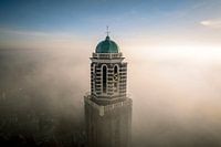 De Peperbustoren van de rooms-katholieke Onze Lieve Vrouwe ten Hemelopneming-basiliek in Zwolle steekt boven de mist uit. De kerktoren, die Peperbus (peperbus) wordt genoemd, is een van de hoogste en beroemdste kerktorens van Nederland.