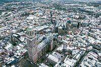 Peperbus toren drone view in de stad Zwolle, Overijssel tijdens een koude voorjaarsochtend. De kerktoren steekt af tegen de besneeuwde daken in de binnenstad van Zwolle op de achtergrond. Er ligt wat sneeuw op de daken tijdens deze uitzonderlijke koude lentedag die meer als winter aanvoelt.